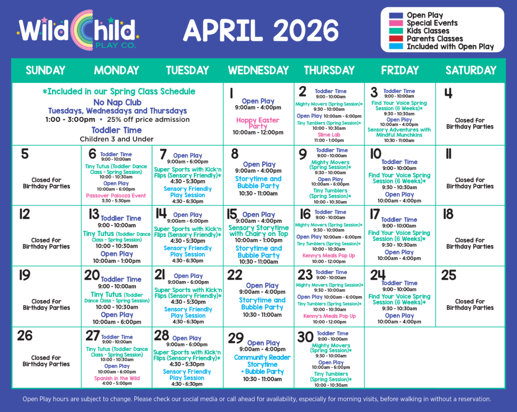This spring at Wild Child, every child can explore their own way to play — from art and music to movement, sensory, and pretend play. Our April class schedule is packed with pop-ups, series classes, and special events designed to spark curiosity, build confidence, and make every visit unforgettable.